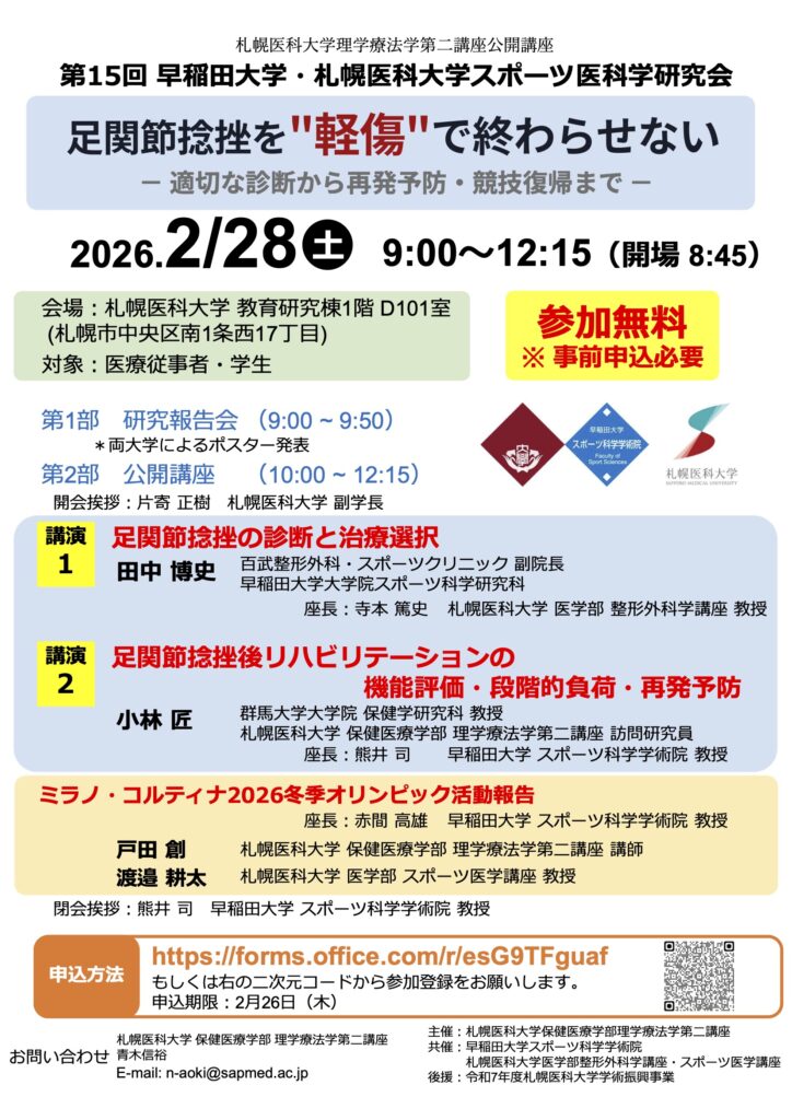 札幌医科大学保健医療学部 理学療法学第二講座の主催(スポーツ医学講座共催)で、公開講座「第15回 早稲田大学・札幌医科大学スポーツ医科学研究会」を開催いたします。